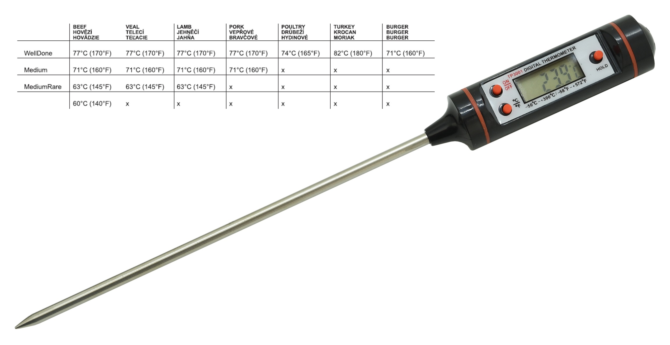 Součástí sady je i injekce pro aplikaci marinády do masa a praktický teploměr s nerezovou sondou pro ověření provedení masa s rozsahem měření -50 – 300°C. O napájení teploměru se stará 1x baterie LR44 (1,5V).