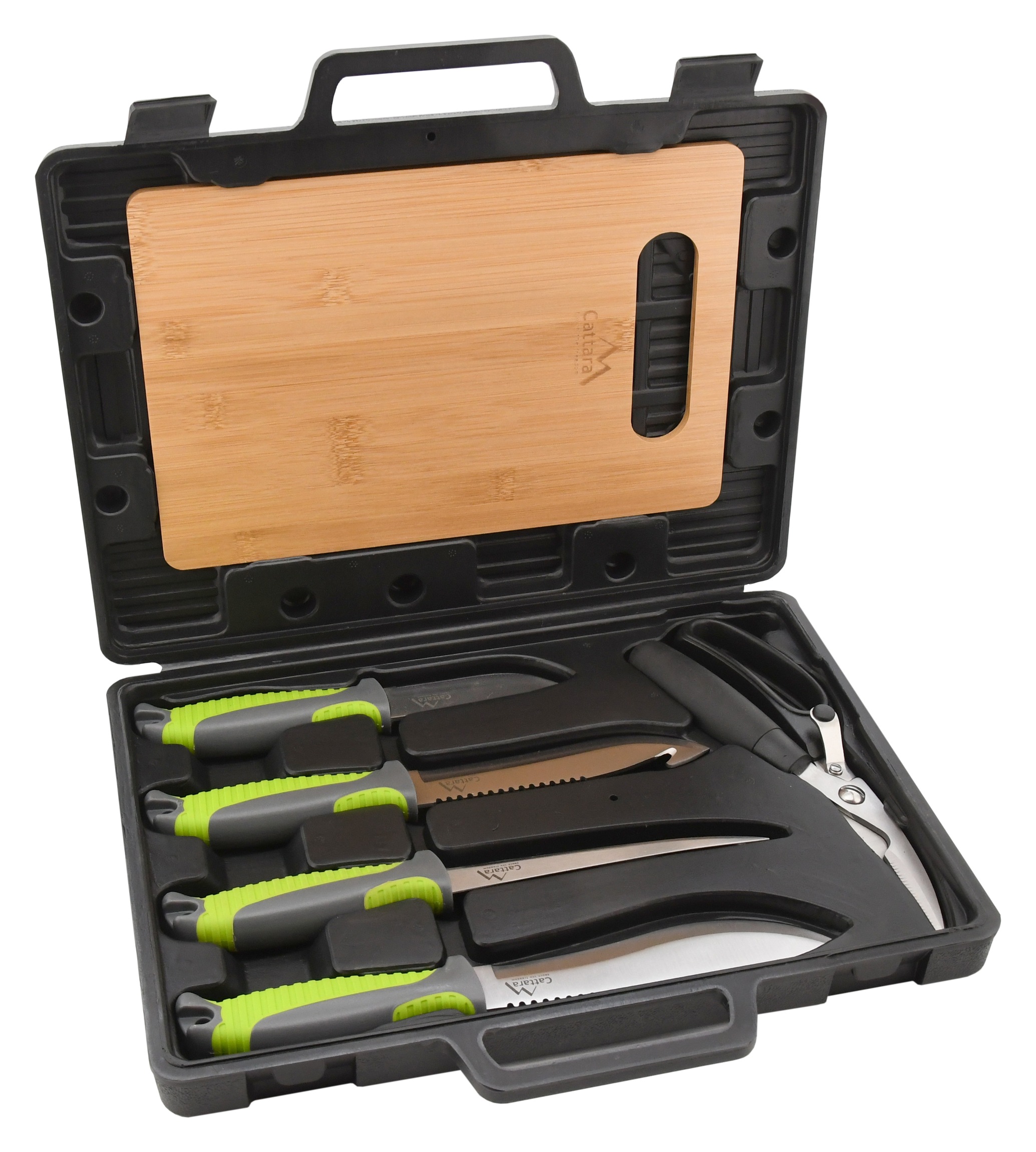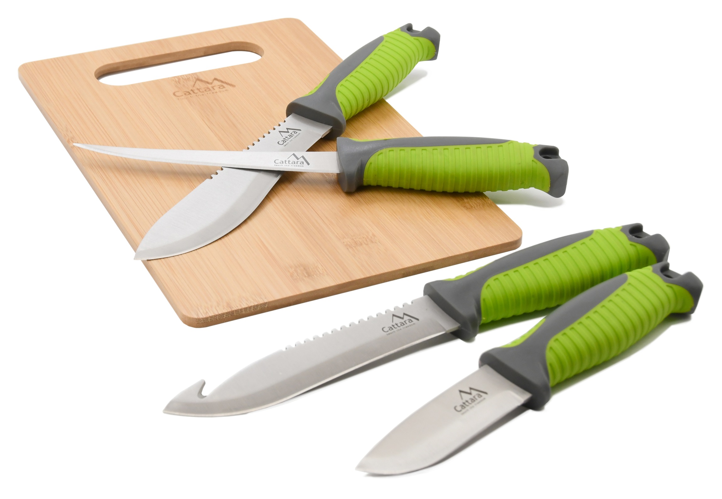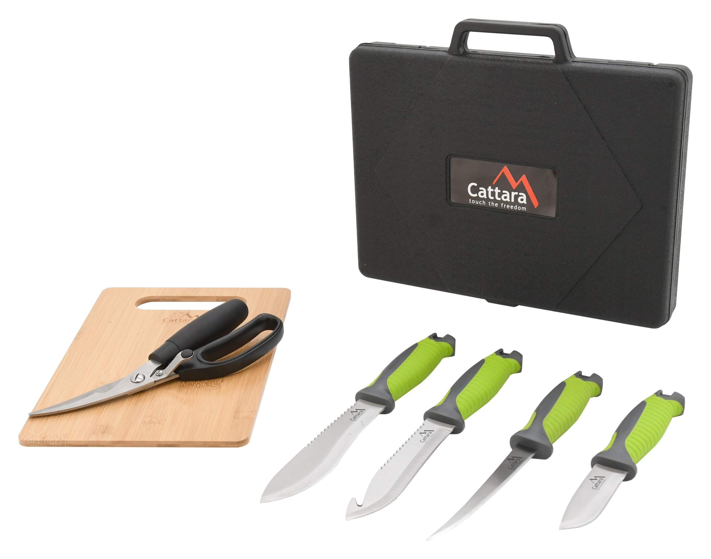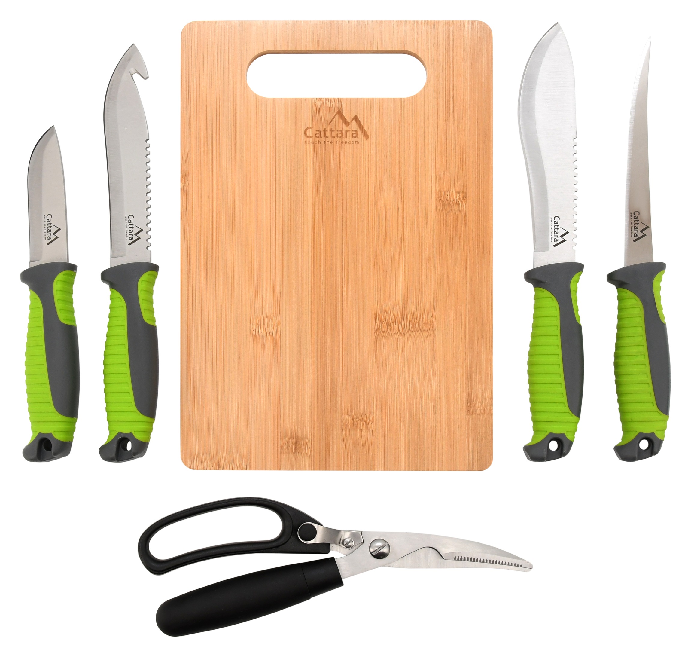Grilovací sada skládající se ze malého, středního, velkého a filetovacího nože. Všechny nože jsou vyrobeny z nerezové oceli s plastovou, ergonomicky tvarovanou rukojetí s pogumovaným povrchem. Nůžky na drůbež jsou vyrobeny z nerezové oceli a pro pohodlné držení jsou opatřeny širokou rukojetí. Poslední součástí sady je bambusové prknéko o rozměru 19,5 x 29 x 0,65 cm vhodné k porcování.