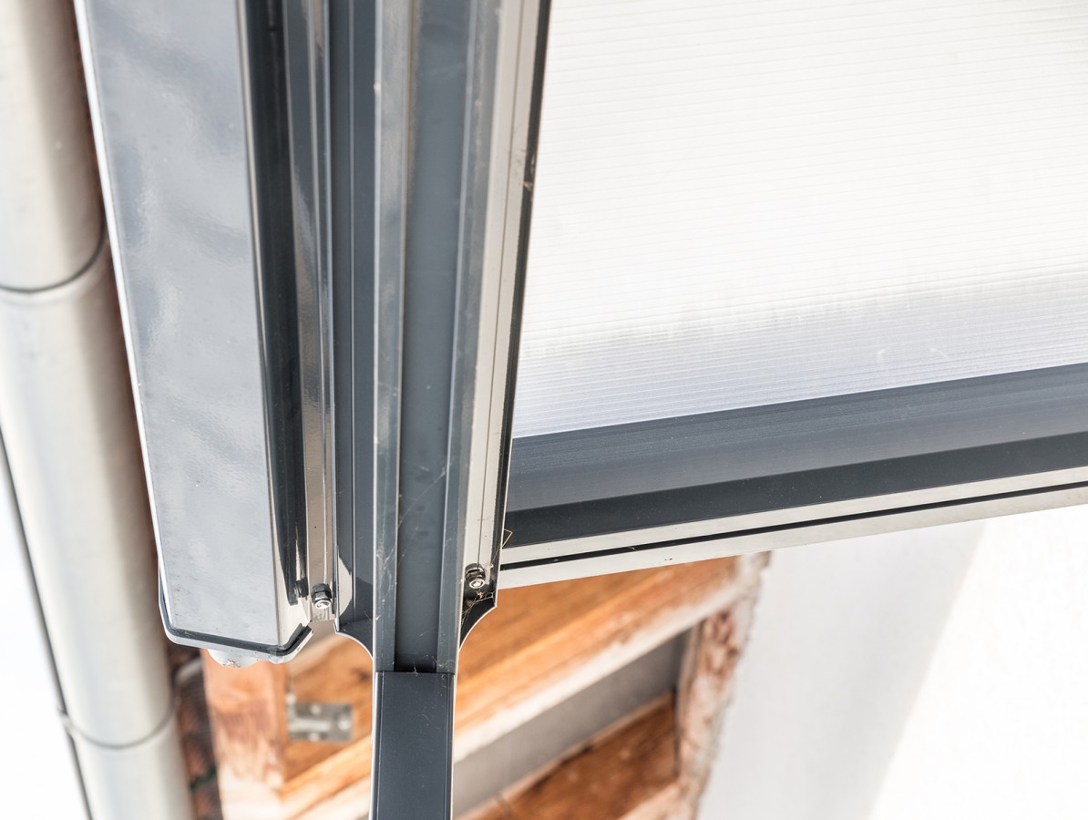 Zastřešení je řešeno průsvitným komůrkovým polykarbonátem Guttagliss DUAL BOX 10 mm s propustností světla 79%, který je opatřen speciální strukturou pro rozptyl světla. Důležité je také uzavření komůrek ventilační páskou, které zamezuje vzniku kondenzátu a dalšímu nechtěnému znečištění.Polykarbonát je opatřen jednostrannou UV ochranou. To vše zaručuje vysokou odolnost proti nepříznivému počasí. Komůrkový polykarbonát splňuje veškeré podmínky pro udělení atestace zdravotní nezávadnosti toxikologickým centrem, vydaným státním zdravotním ústavem.