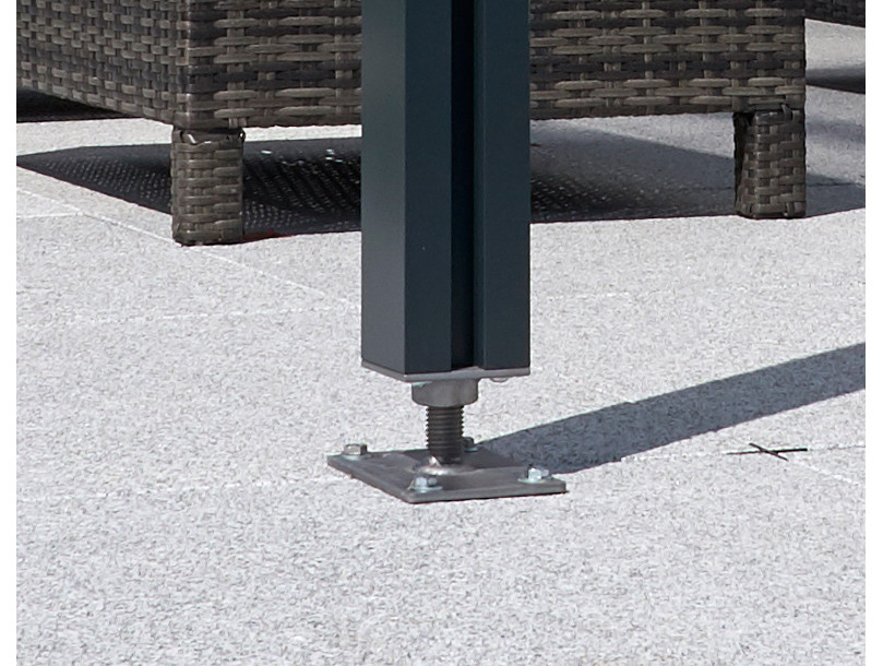 Robustní konstrukce pergoly je vyrobena z vysoce odolných, eloxovaných, hliníkových dutých profilů 8 x 8 cm, opatřených antikorozním nástřikem práškovým lakováním v antracotové barvě. Díky tomu je pergola vysoce odolná vůči rezavění, plísním a mechům a je v podstatě bezúdržbová. Sloupky jsou opatřeny výškově stavitelným systémem pro snadné vyrovnání výškových nerovností. Pergola je vybavena integrovaným okapem s výstupem vody na obou stranách.