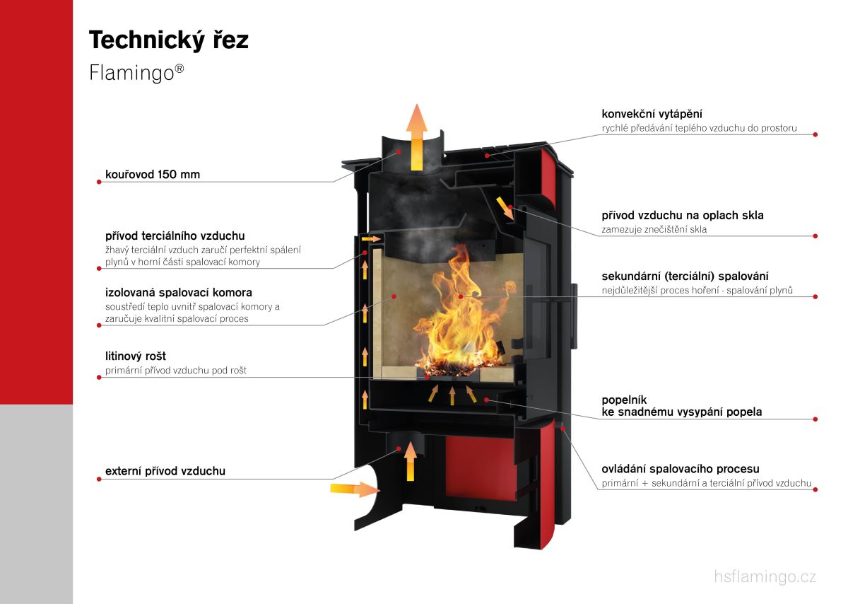Hlavní předností je sekundární spalování, které pomocí terciárního přívodu vzduchu zajišťuje vysokou účinnost spalování, kdy dochází k procesu zužitkování zbytkových hořlavých plynů, které by běžně odcházely se zplodinami komínem a tím i nižší spotřebu dřeva.