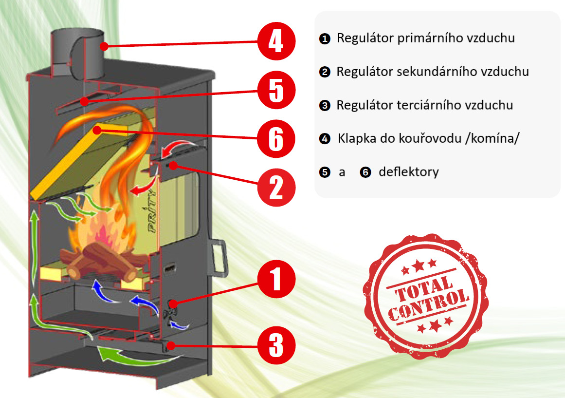 Krbová kamna s litinovou horní deskou v elegantní černé barvě kombinují moderní vzhled s odolnou konstrukcí. Korpus je vyroben z ocelového plechu o síle 2–3 mm, čo zaručuje pevnost a dlouhou životnost. Spalovací komora je obložena akumulačními šamotovými cihlami pro efektivní hoření a uchování tepla. Dvířka jsou osazena keramickým sklem odolným až do 850 °C a těsněním ze skelných vláken, které zajišťuje bezpečný provoz. Na dně topeniště se nachází litinový rošt pro spolehlivé spalování. Součástí kamen je také praktická komínová klapka pro snadnou regulaci tahu.