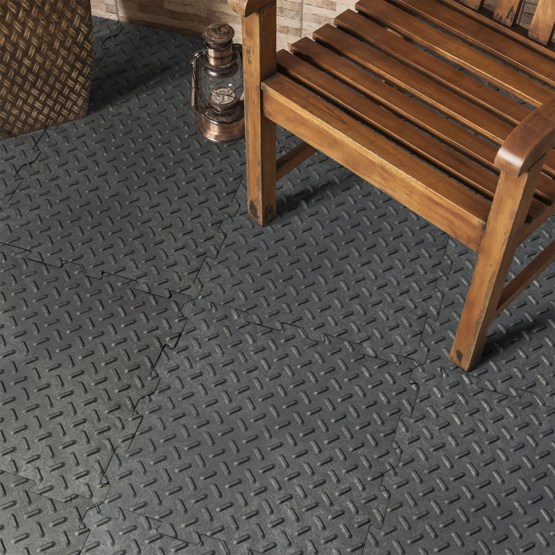 Pryžový materiál vyniká v tlumení vibrací, hluku a protiskluzových vlastnostech. Tloušťka této dlažby činí 6 mm a díky jejím speciálním zámkům není třeba ukončovat dlažbu rohy či okrajem.