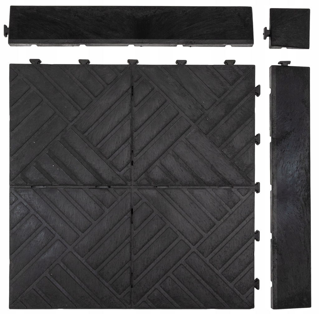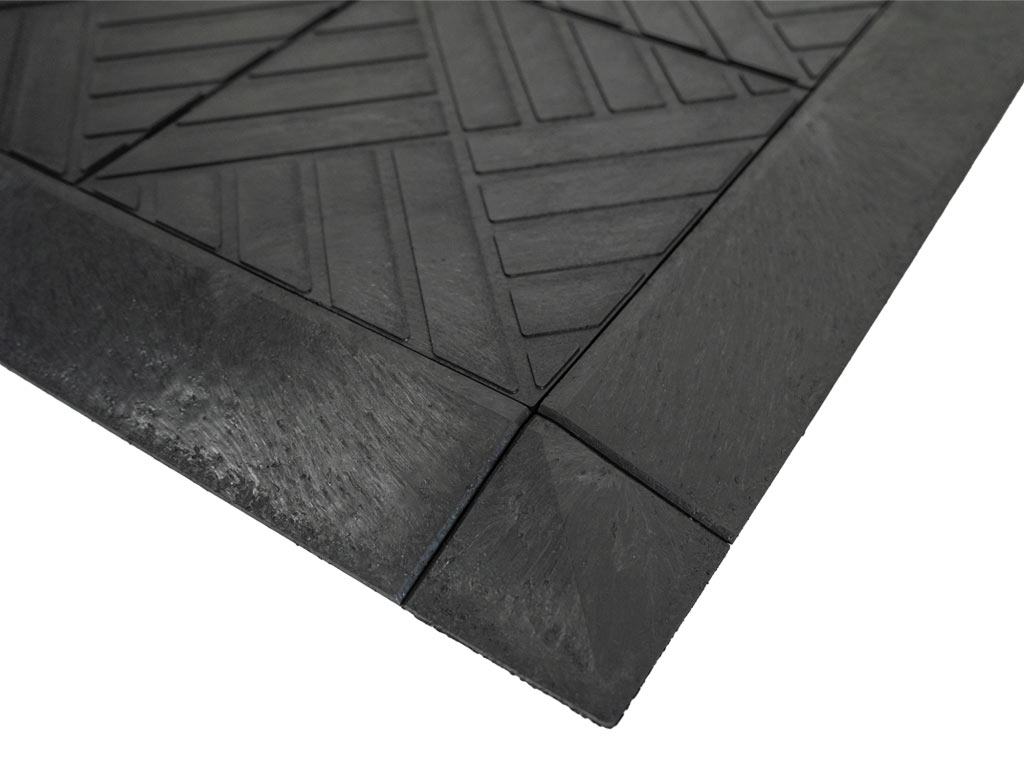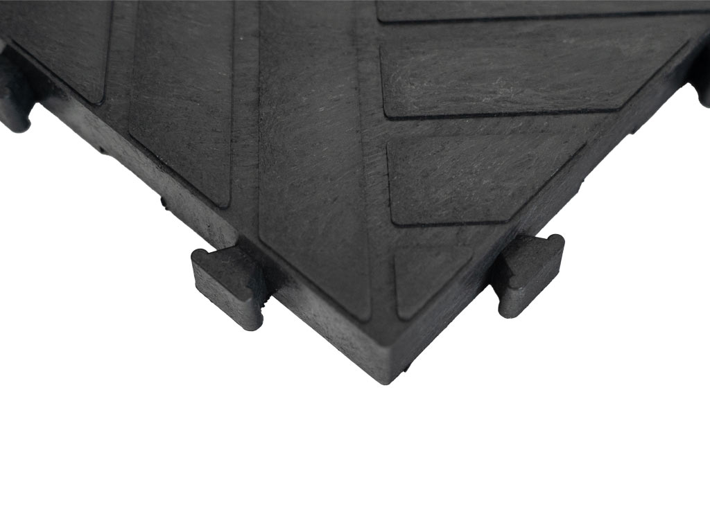 Pryžový materiál vyniká v tlumení vibrací, hluku a protiskluzových vlastnostech. Tloušťka této dlažby činí 2 mm a díky jejím speciálním zámkům není třeba ukončovat dlažbu rohy či okrajem.