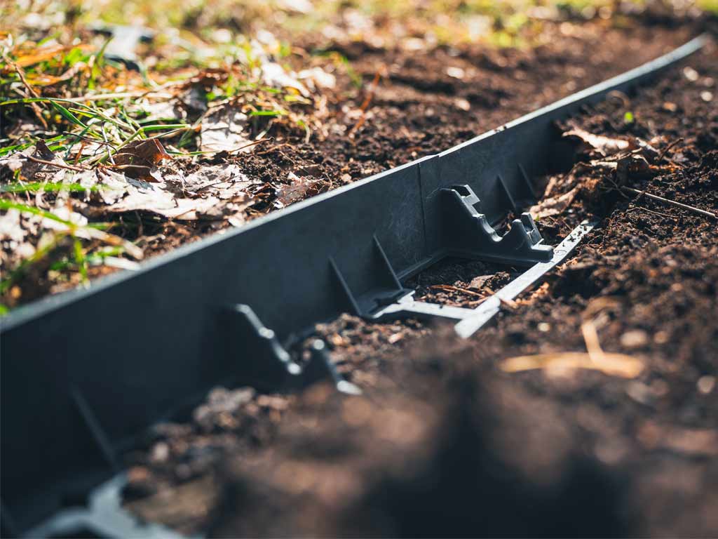 Plastový obrubník LEGI pro neviditelné ohraničení záhonů. Vysoká flexibilita, snadná montáž a nízká cena.