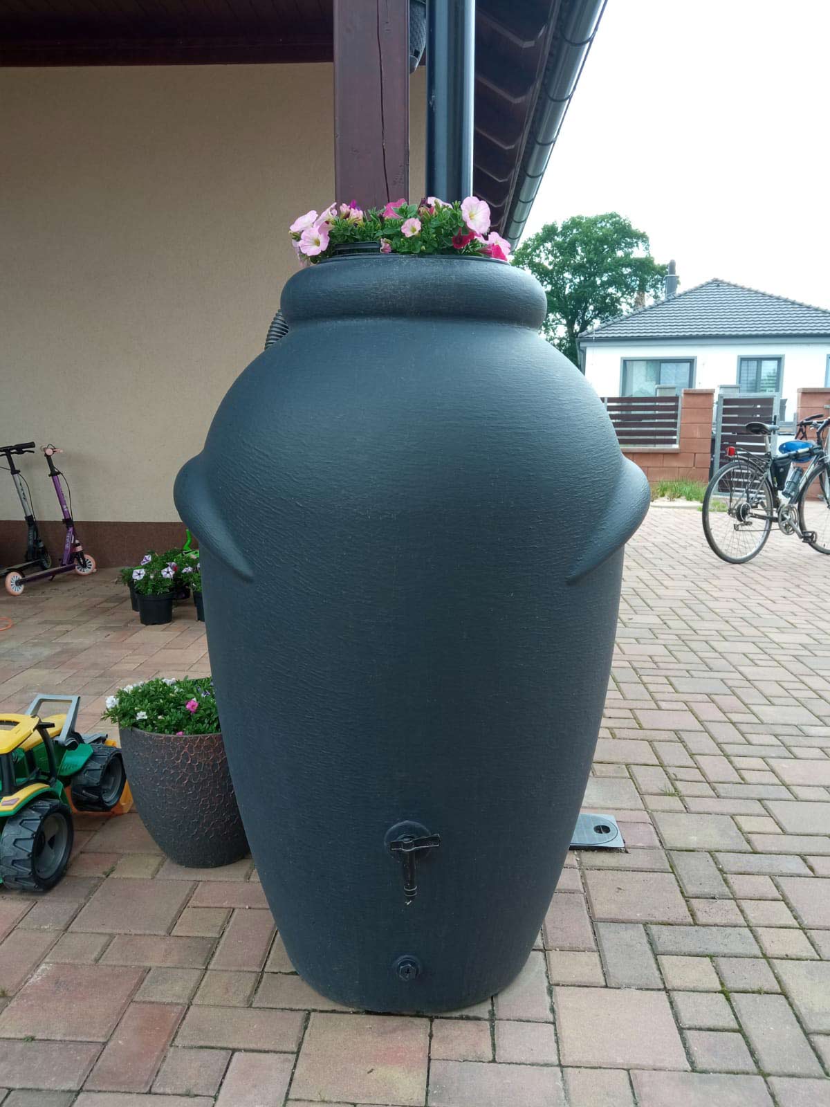 Tvar a konstrukce nádrže je inspirována modelem starověké amfory, kterou se tak nemusíte stydět umístit na viditelné místo vaší zahrady. Nádoba na dešťovou vodu je vyrobena z kvalitního plastu, který je odolný vůči povětrnostním vlivům. Největší předností této nádrže na vodu je její elegantní provedení, použité kvalitní materiály a především její praktičnost. Nádrž je ve své spodní části vybavena dvěma otvory pro výpust vody. Jedna je určena pro napojení kohoutku, ta kousek od země poté na napojení hadice na vodu.