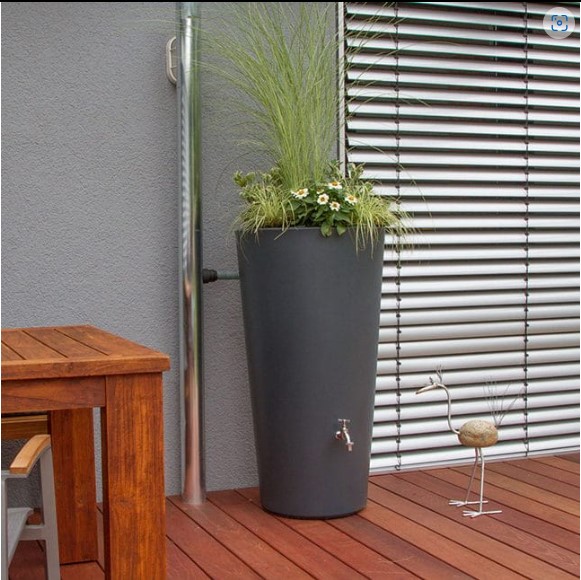 Moderní nádrž na dešťovou vodu Rainbowl Flower ve tvaru vázy je vyrobena z kvalitního plastu, který je odolný vůči povětrnostním vlivům. Největší předností této nádrže na vodu je její elegantní provedení, použité kvalitní materiály a především její praktičnost. Nádrž je ve své spodní části vybavena dvěma otvory s 3/4″ mosazným závitem pro výpust vody. Jeden je určen pro napojení kohoutku ITAP, ten kousek od země poté na napojení hadice na vodu, nebo pro úplné vypuštění nádrže. Konstrukčně je tento typ sudu tzv. foukán, aby byl na rovném povrchu dobře stabilní a tudíž není potřeba podstavce. Povrchová úprava připomíná tmavě šedý beton, takže se snadno přizpůsobí fasádám moderních domů. V horní části má trvale integrovanou výsadbovou komoru, do které můžete zasadit květiny podle ročního období a vytvořit tak z nádoby záhon.