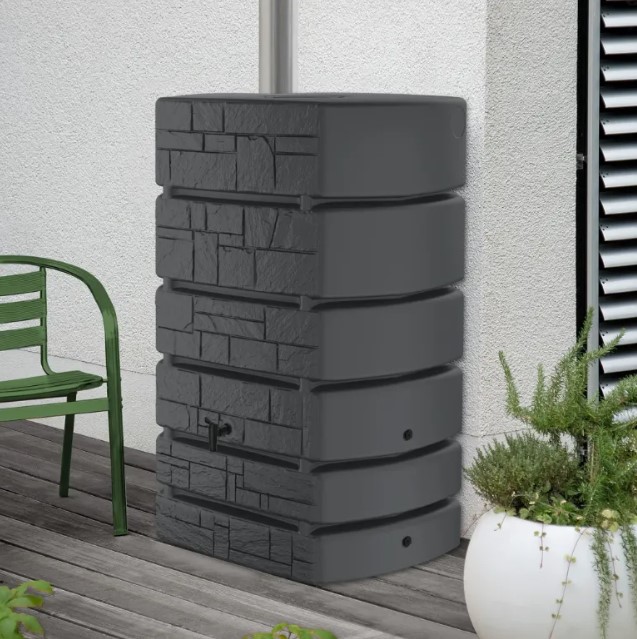 Praktická nádrž na dešťovou vodu TOWER STONE o objemu 500 litrů v antracitové barvě může být jednou ze součástí vašeho integrovaného systému úspory vody. Díky dešťové vodě je zalévání zahrady mnohem ekonomičtější a pro rostliny, jak okrasné a užitkové i prospěšnější. Díky obsahu dusíku ve vodě se tento prvek dostává k rostlinám pro ně přirozenou formou. Dešťová voda neobsahuje chlór, žádné soli vápníku a hořčíku, což jsou chemické látky, které způsobují trvalou nebo dočasnou tvrdost vody. I proto je vhodná pro kapkové závlahy, které se nezanášejí a lépe fungují.