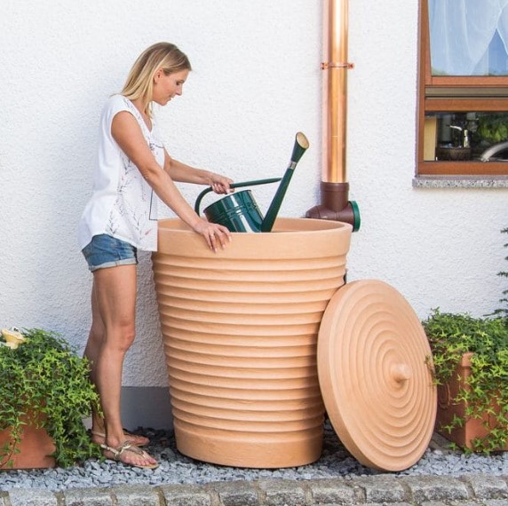Dekorativní sud na dešťovou vodu TRENTINO terakota o objemu 275 litrů vypadá jako velká terakotová nádoba, a proto se hodí zejména do zahrad ve středomořském stylu, skalnatých zahrad, vypadá skvěle vedle cihlové fasády a ve společnosti keramických květináčů. Díky dešťové vodě je zalévání zahrady mnohem ekonomičtější a pro rostliny, jak okrasné a užitkové i prospěšnější. Díky obsahu dusíku ve vodě se tento prvek dostává k rostlinám pro ně přirozenou formou. Dešťová voda neobsahuje chlór, žádné soli vápníku a hořčíku, což jsou chemické látky, které způsobují trvalou nebo dočasnou tvrdost vody. I proto je vhodná pro kapkové závlahy, které se nezanášejí a lépe fungují.