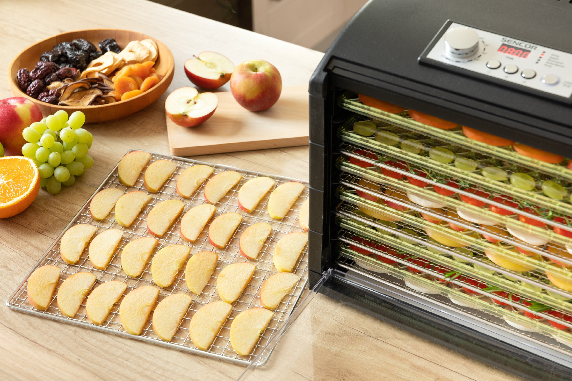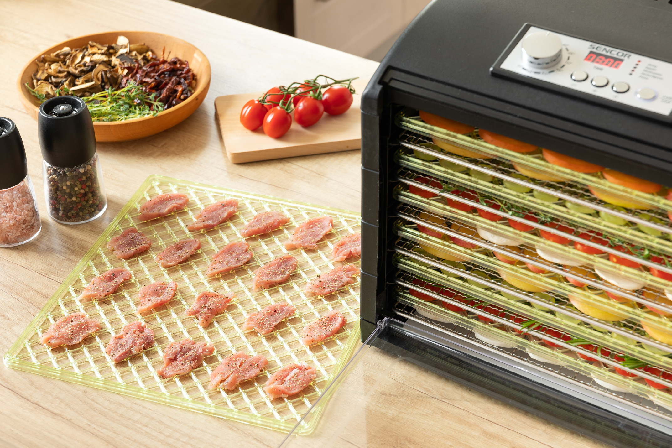 Sušička potravin SENCOR SFD 6601BK s příkonem 500 W, 12 tepelně odolnými podnosy a sušící plochou 1,18 m2 (o 65 % větší než běžná sušička s průměrem 32 cm). Usušte si kvalitní potraviny bez zbytečně přidaných konzervantů a cukrů. Stačí jen nakrájet vybrané suroviny na plátky a naskládat je vedle sebe. Po nastavení času se automaticky spustí odpočítávání.Sušička ovoce 5 automatických programů pro – Sušené maso – Jablka – Houby – Bylinky / Koření – Těstoviny. Jakmile je dosušeno, sušička se sama automaticky vypne. Díky LED diodám a časovači budete mít celý proces pod dohledem.Regulace teploty 35-70 °C umožňuje zachovat maximální množství přírodních látek. Sušička má dvanáct plátů, na jeden plát se vejde pět set gramů. Design mřížky sušících podnosů zabraňuje vzniku plísní a optimalizuje proudění vzduchu.