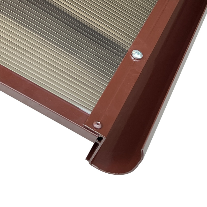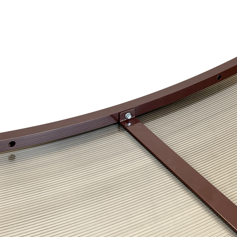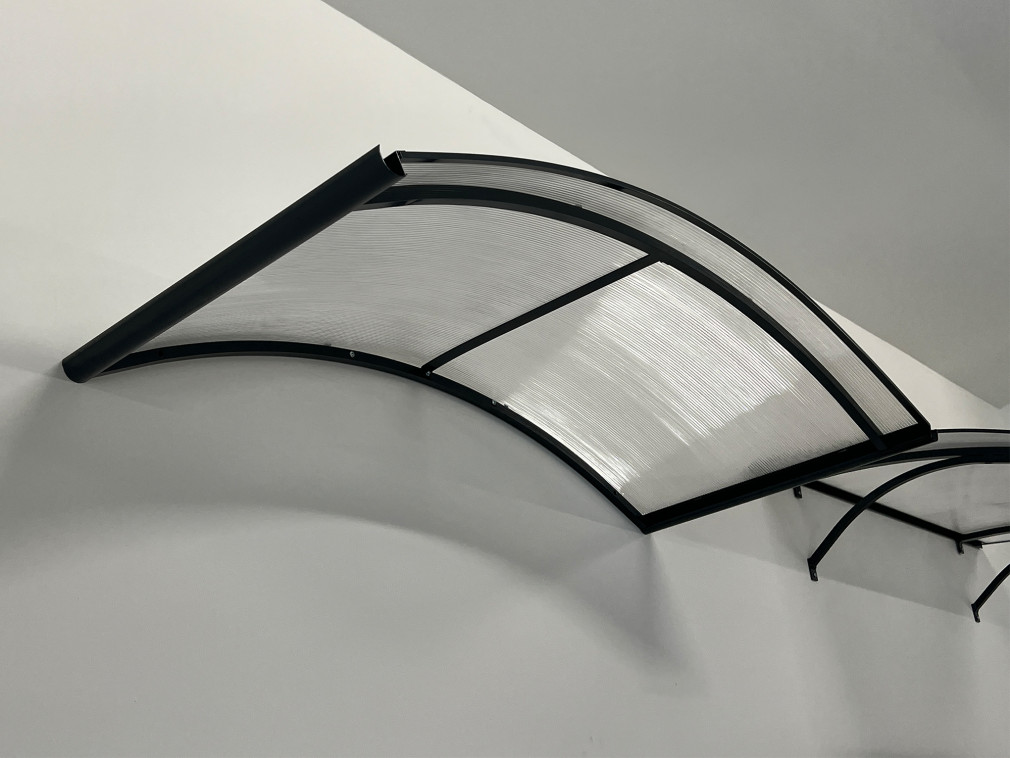 Stříška má nosnou konstrukci vyrobenou z práškově lakovaného hliníku hnědé barvy RAL 70167 a vyplněna je UV odolným, bronzovým, 6mm dutinkovým polykarbonátem. Stříšku nabízíme v rozměrech – šířka 150 cm × hloubka 70 cm × výška oblouku 20 cm. Hliníková konstrukce perfektně odolává vlivům počasí, i po letech je pevná a stabilní. V zimě mrazem nekřehne a ani na silném letním slunci nedochází ke změnám barvy.