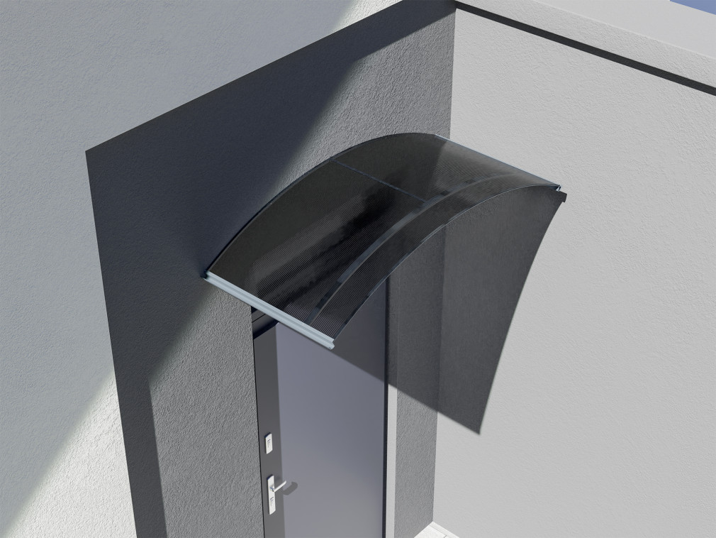 Hliníková stříška nad vchodové dveře RODEO 150 × 70 cm zkrášlí prostor vstupu do vašeho domu a současně je dokonalou ochranou vašich dveří před deštěm, sněhem a větrem. Zvýšený komfort vám zajistí integrovaný okapový žlab po obou stranách, kam můžete umístit sběrné nádoby na vodu. Je vhodná pro zastřešení vchodů, balkonů, výloh obchodů, nebo například pro zastřešení nad bankomaty. Díky obloukové konstrukci je mimořádně stabilní.