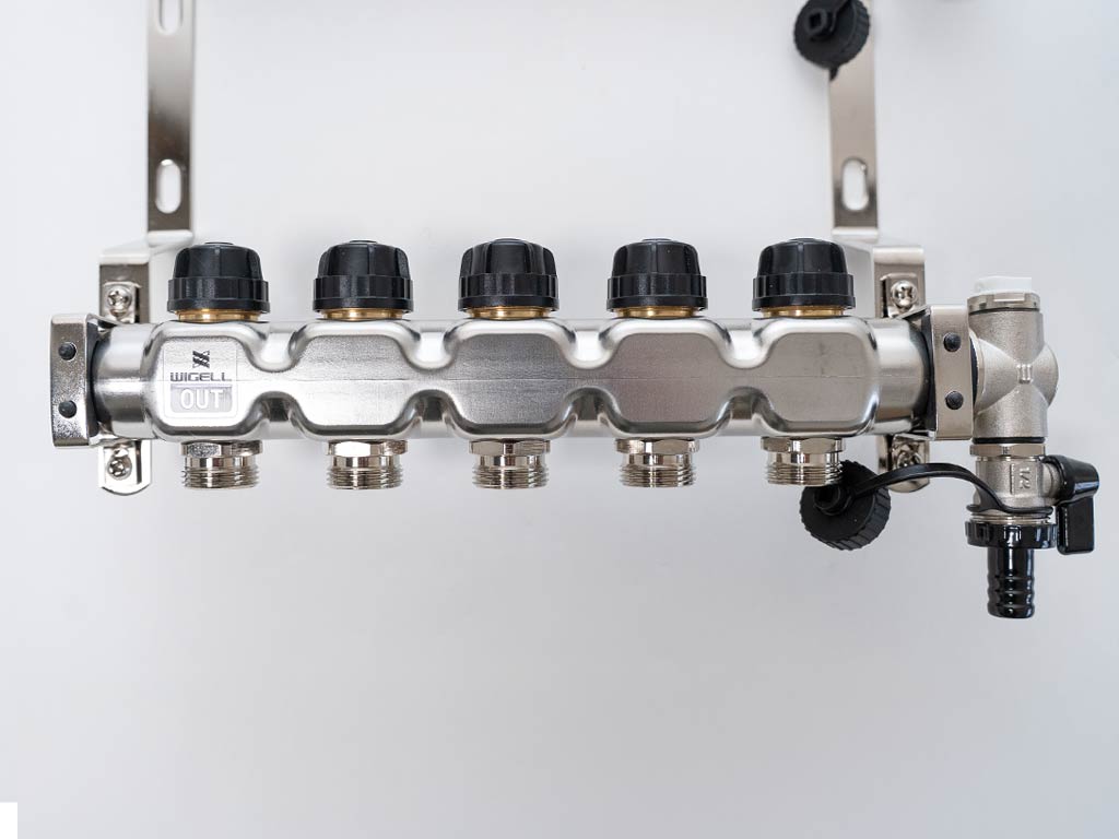 Rozdělovače Wigell lze namontovat přímo na stěnu nebo pomocí dodaných držáků do skříně rozdělovače. Montážní poloha je libovolná. Na tento rozdělovač můžete pomocí svěrného šroubení připojit trubky PeX-AL-PeX nebo Pe-rt.