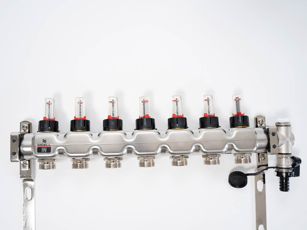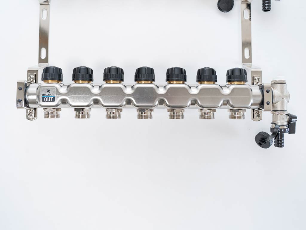 Rozdělovače Wigell lze namontovat přímo na stěnu nebo pomocí dodaných držáků do skříně rozdělovače. Montážní poloha je libovolná. Na tento rozdělovač můžete pomocí svěrného šroubení připojit trubky PeX-AL-PeX nebo Pe-rt.