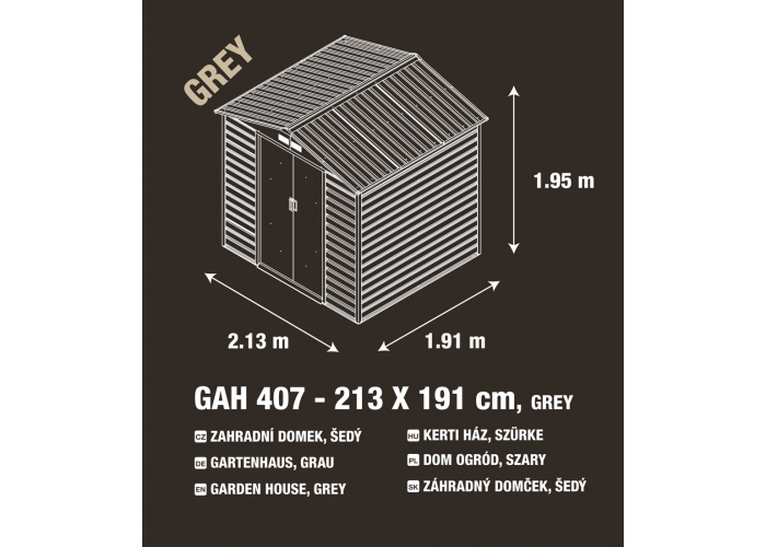 Montáž domku je velmi jednoduchá. Doporučujeme jej instalovat na velkoformátovou dlažbu nebo na betonový základ. Na pevný pozinkovaný rám přimontujete ocelový, pozinkovaný plech s práškovým nástřikem, který je odolný vůči špatnému počasí. Součástí balení jsou také dveřní úchyty. Šířka přední strany činí 213 cm, výška v nejvyšším bodě je 190 cm a šířka boční strany je 191 cm. Výška boční stěny bez střechy je 163 cm. Na přední straně se nachází posuvné dveře. Součástí je také přehledný návod na montáž, podle kterého lze snadno postupovat. Naleznete jen také výše v dokumentech ke stažení.
