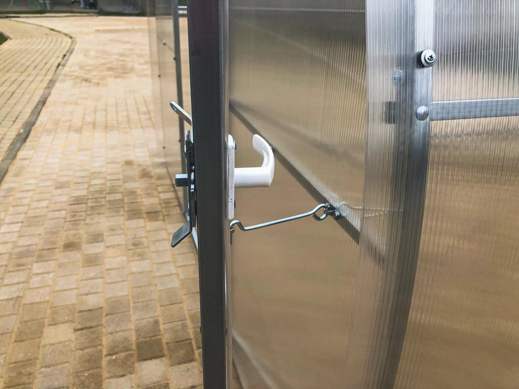 Zasklení skleníku je tvořeno čirým dutinkovým (komůrkovým) polykarbonátem o tloušťce 4 mm s UV ochranou, která zamezuje křehnutí materiálu a změně barvy. Polykarbonát je samozřejmě certifikovaný a splňuje veškeré podmínky zdravotní nezávadnosti.
