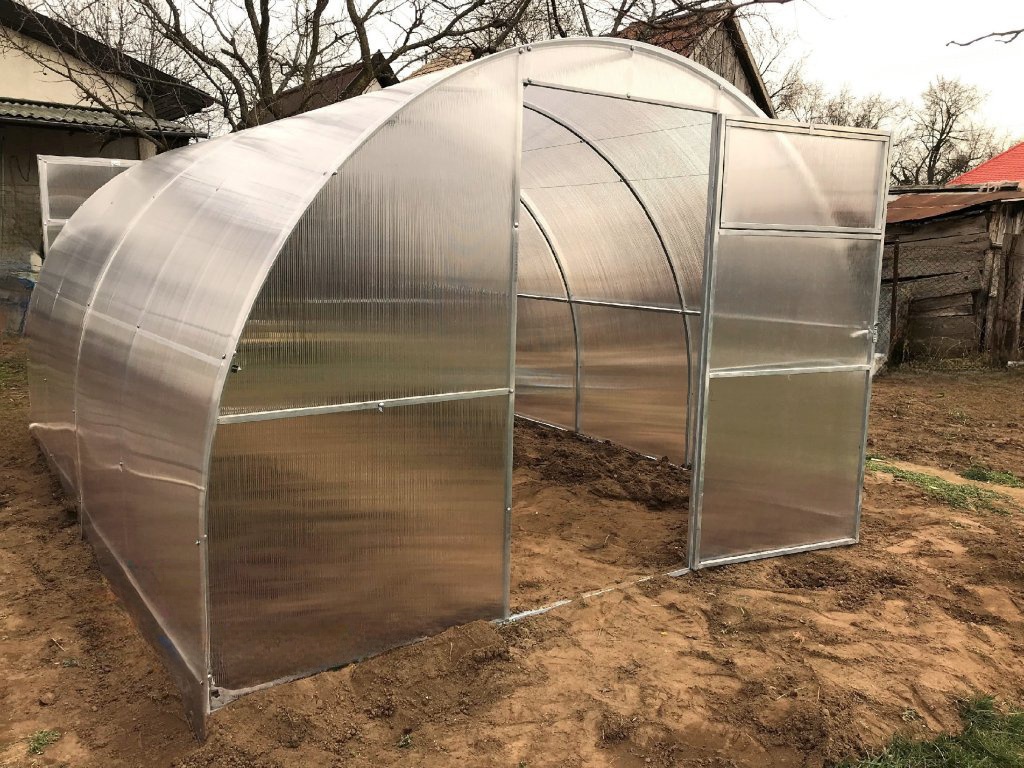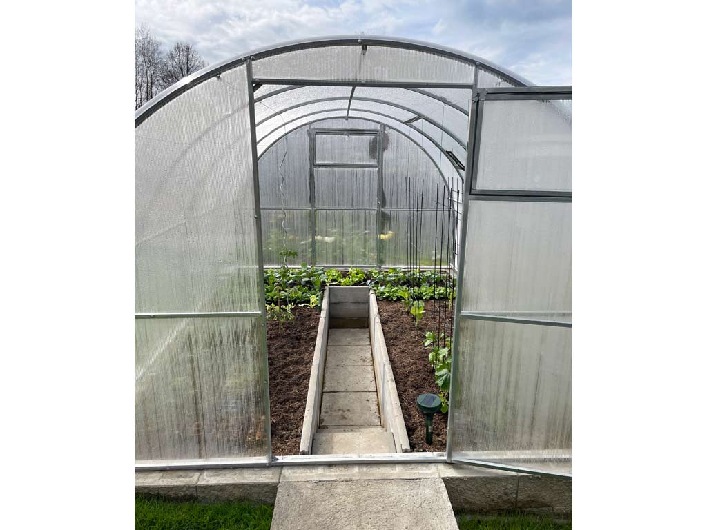 Zasklení skleníku je tvořeno čirým dutinkovým (komůrkovým) polykarbonátem o tloušťce 6 mm s UV ochranou, která zamezuje křehnutí materiálu a změně barvy. Polykarbonát je samozřejmě certifikovaný a splňuje veškeré podmínky zdravotní nezávadnosti.
