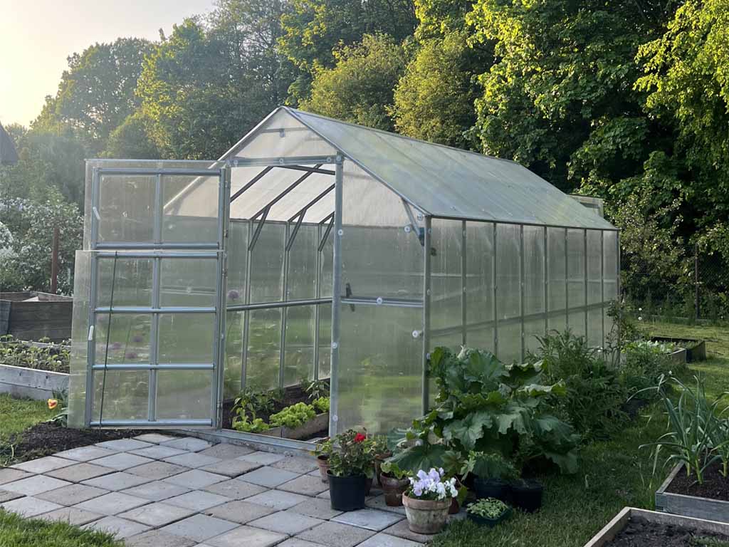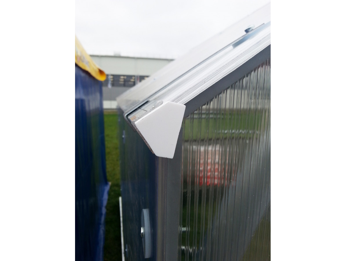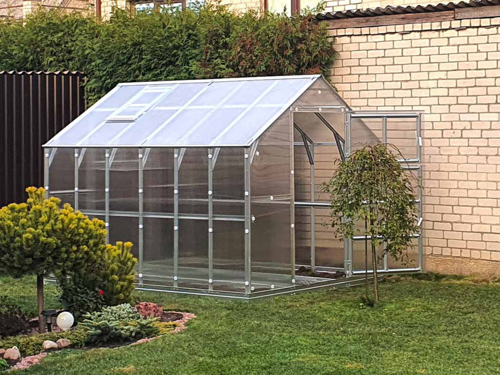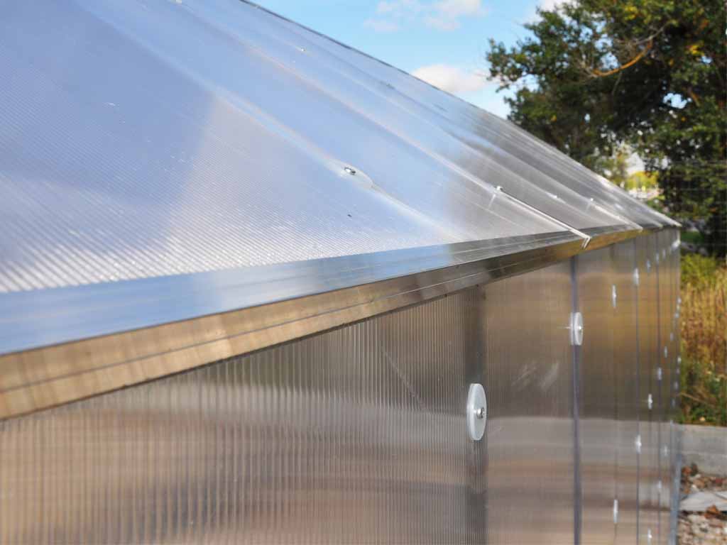Zasklení skleníku je tvořeno čirým dutinkovým (komůrkovým) polykarbonátem o tloušťce 6 mm s UV ochranou, který má zvýšené tepelně izolační vlastnosti, oproti běžně prodávaným skleníkům. Polykarbonát splňuje veškeré podmínky zdravotní nezávadnosti. Polykarbonátové desky jsou již předem naformátovány.