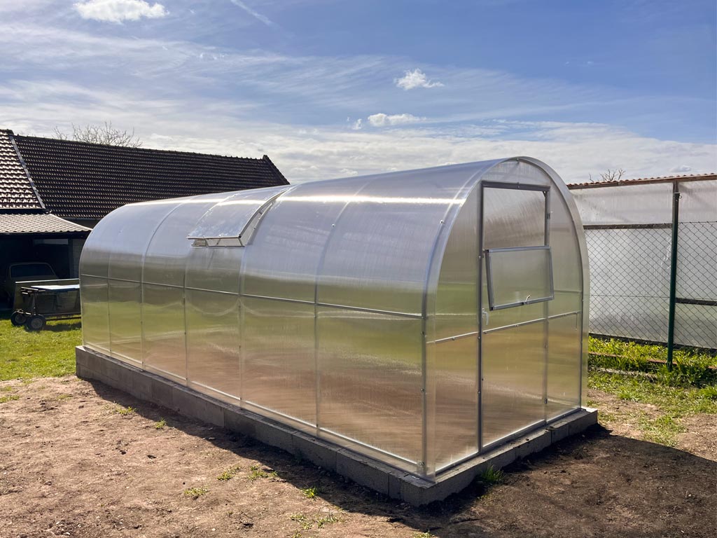 Zasklení skleníku je tvořeno čirým dutinkovým (komůrkovým) polykarbonátem o tloušťce 4 mm s UV ochranou, která zamezuje křehnutí materiálu a změně barvy. Polykarbonát je samozřejmě certifikovaný a splňuje veškeré podmínky zdravotní nezávadnosti.